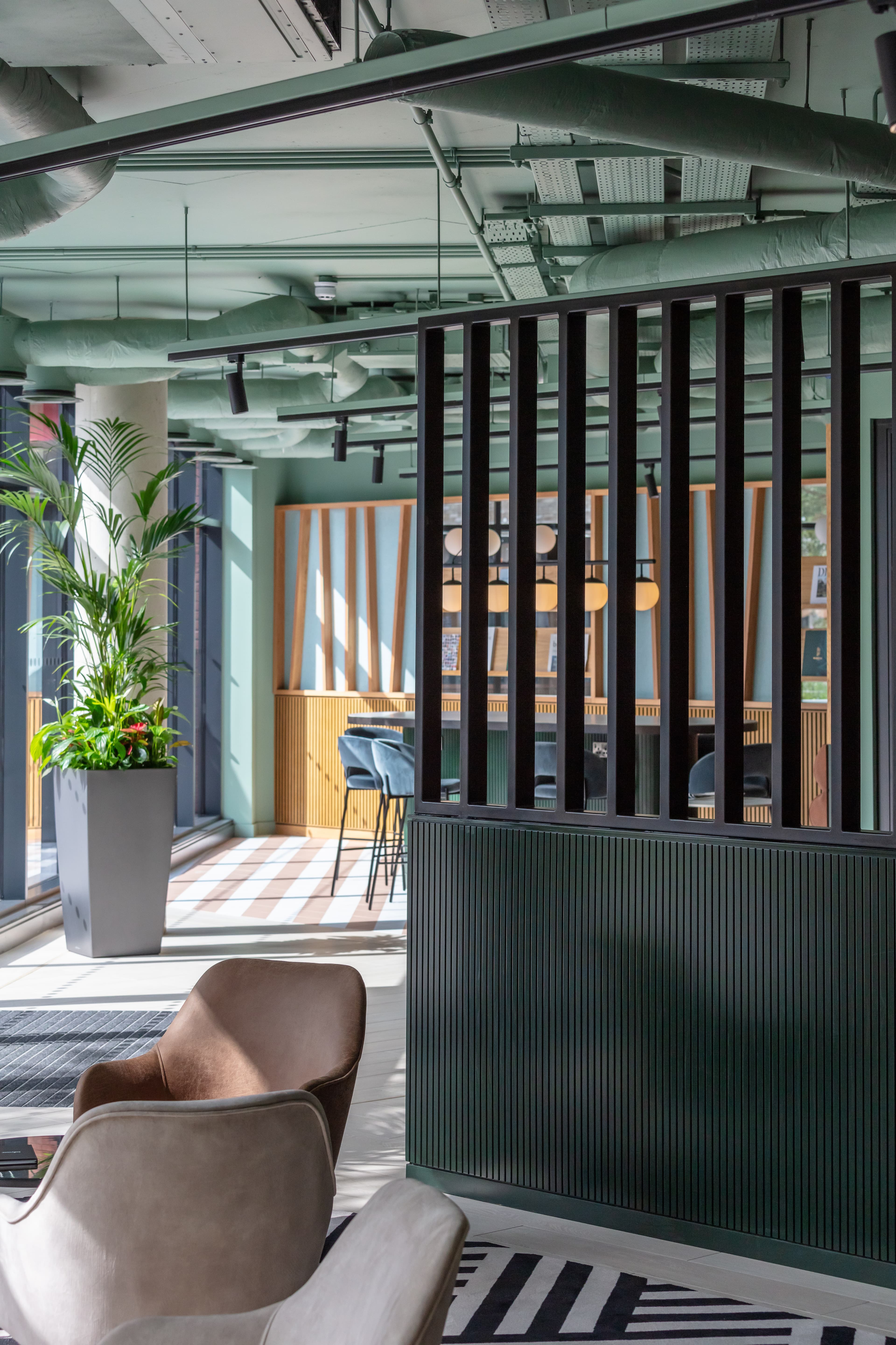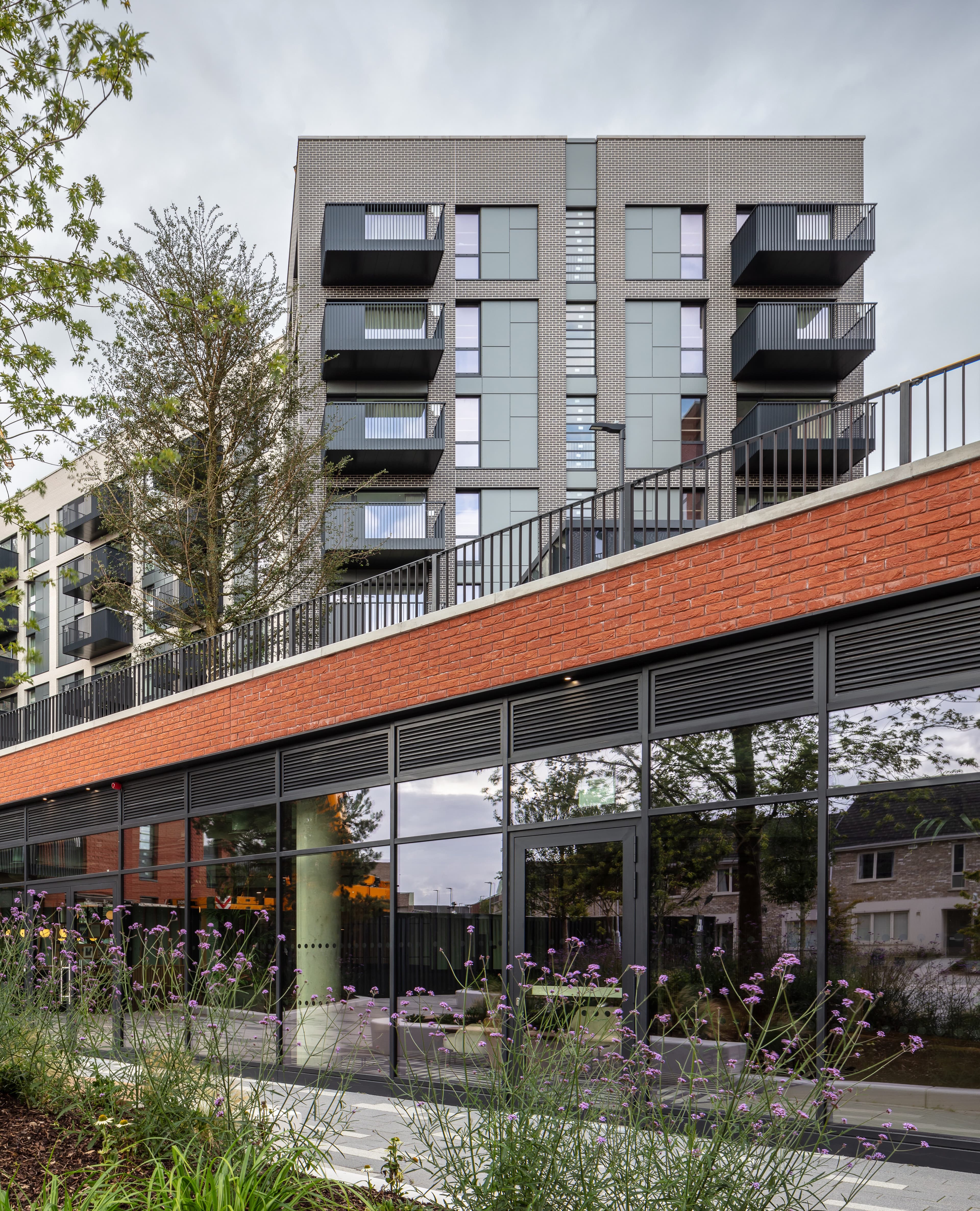 To resolve the challenge of an island site, parking and a principal entrance plaza are located at grade, while new pedestrian routes and landscaped gardens at first floor level link the various blocks and offer a sense of place to residents. The entrance plaza is formed by office and amenity spaces, screening the parking and fostering active use.