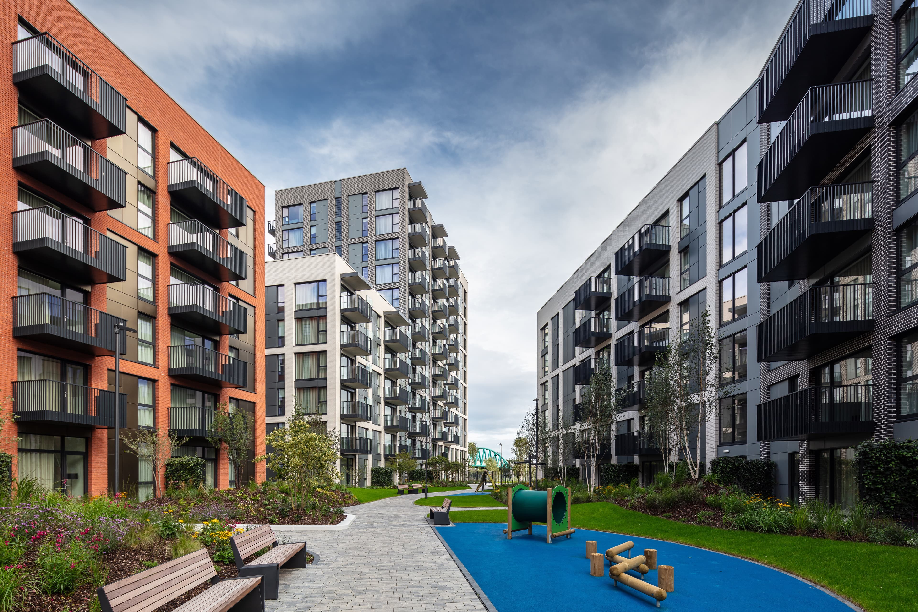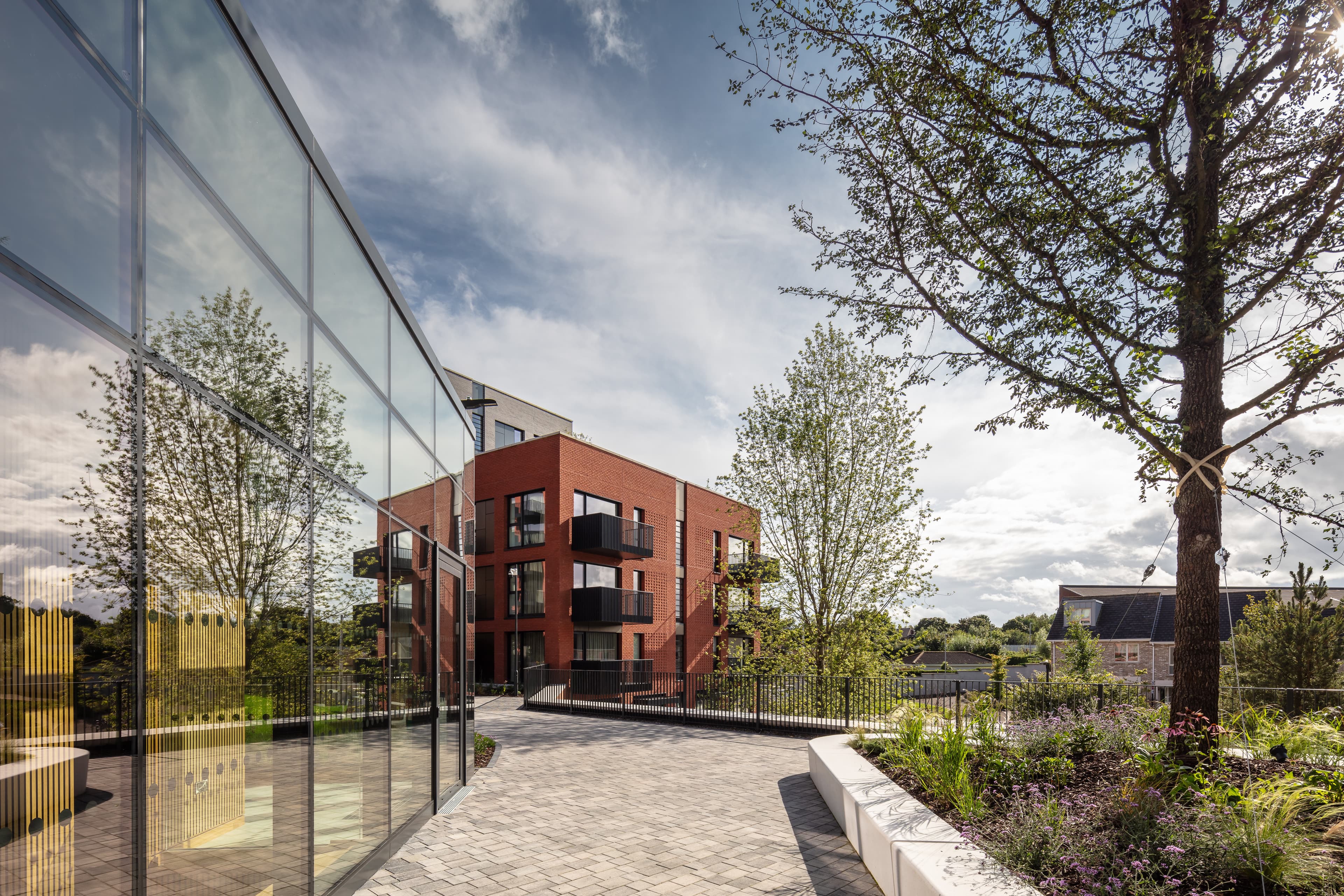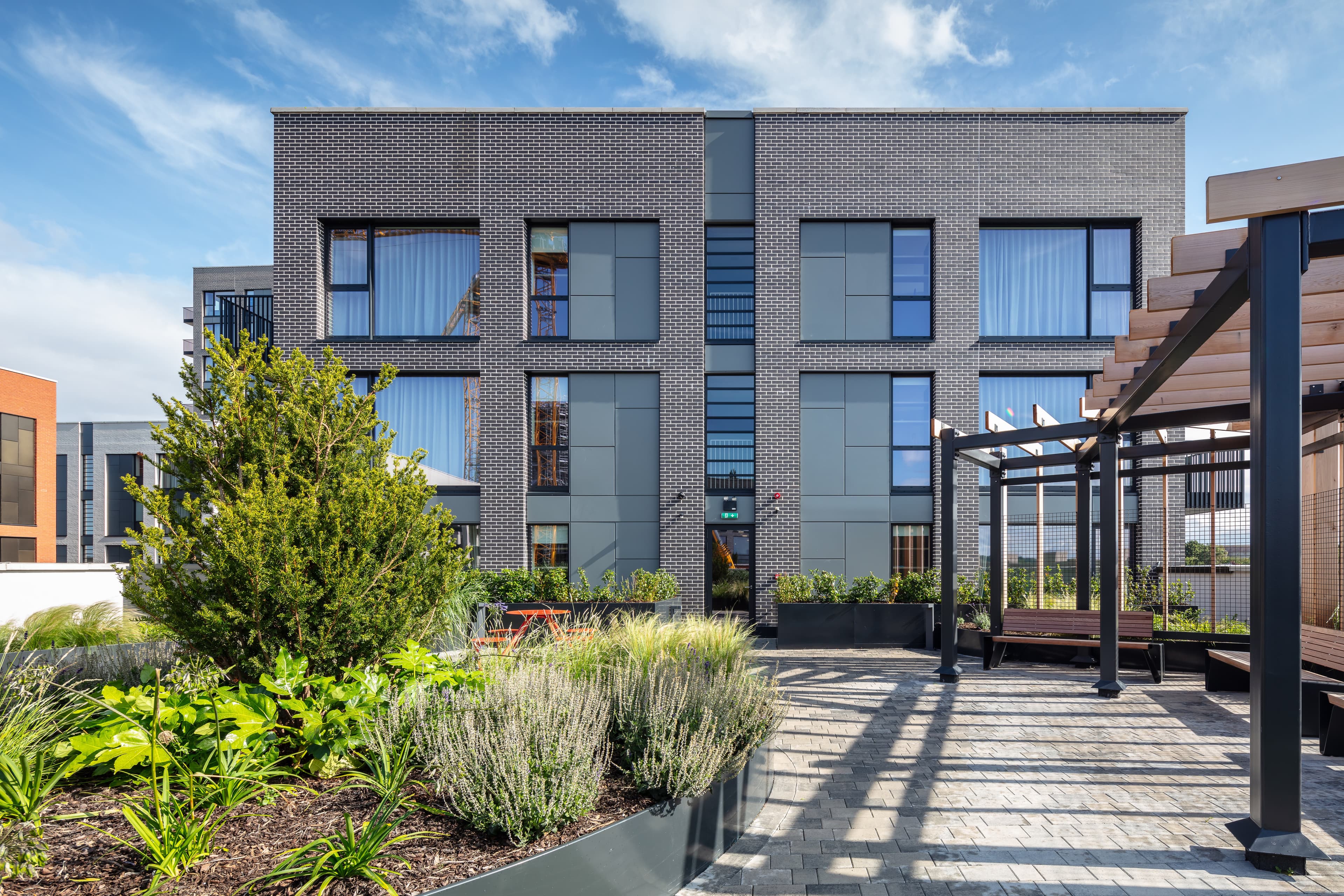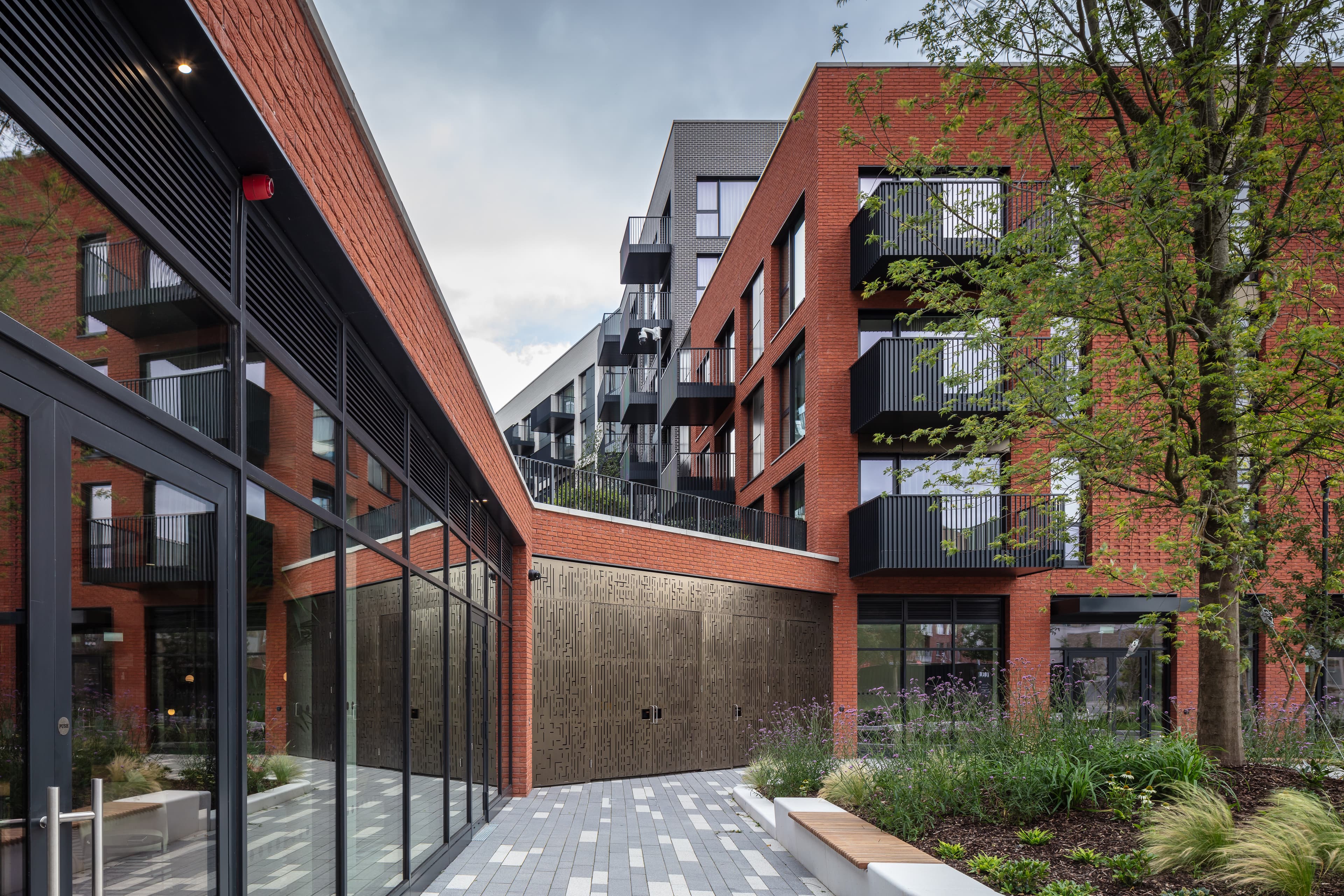 Building facades are subtly articulated to provide shadow and depth, and finished in a range of warm brick colours to provide visual variety.