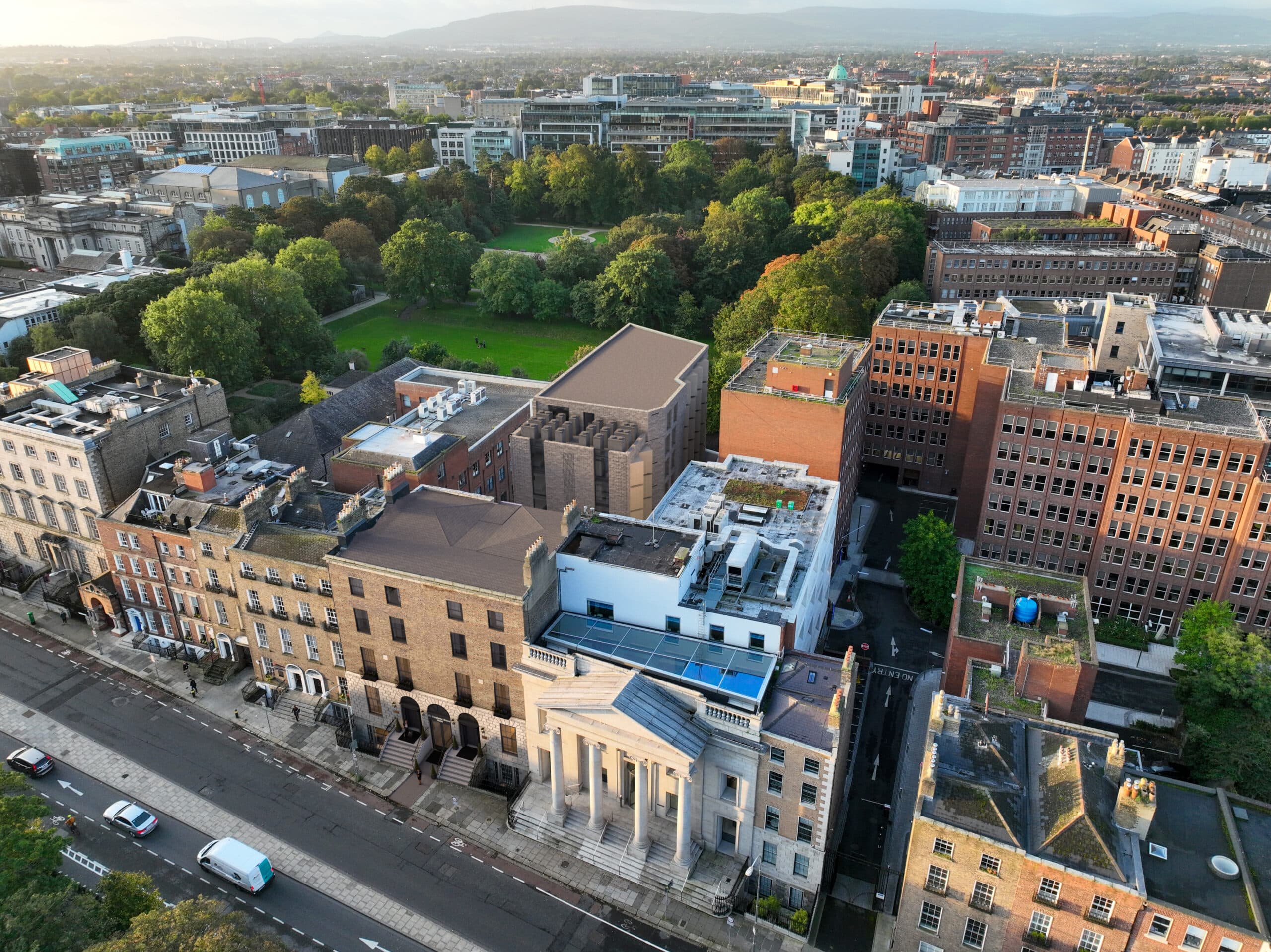 The architectural design incorporated a gap of 13 meters between the protected structures and the newly proposed hotel edifice, strategically concealing it from view on the Stephens Green side. However, on the Iveagh Gardens side, the visual impact of the proposed scheme, while substantial, was mitigated through the integration of stepped terrace gardens away from the boundary into the overall design.