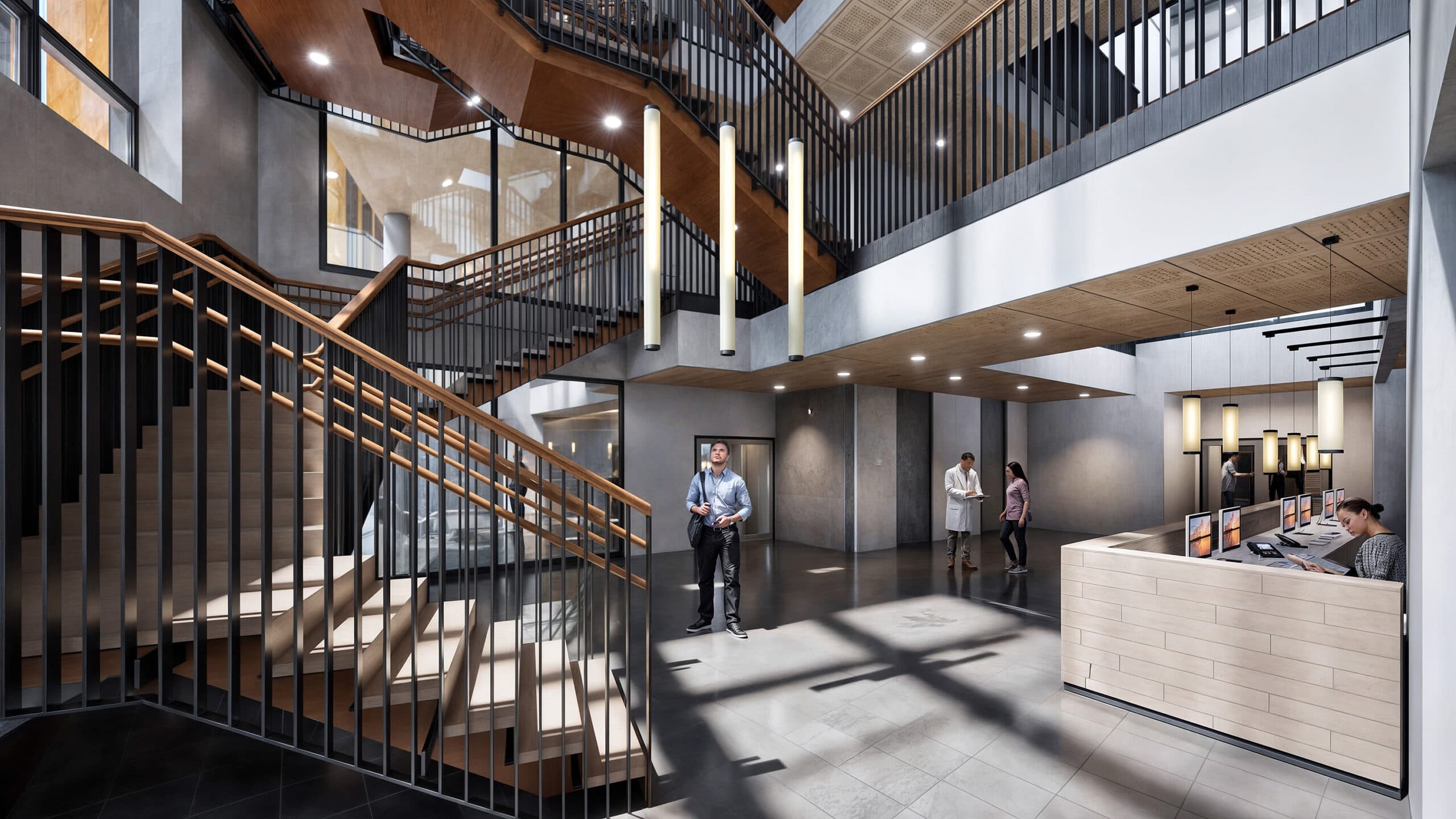 Extensive glazing in the entrance area and central atrium bring daylight deep into the building while these elements also help with orientation, and wayfinding, as users move through the building.