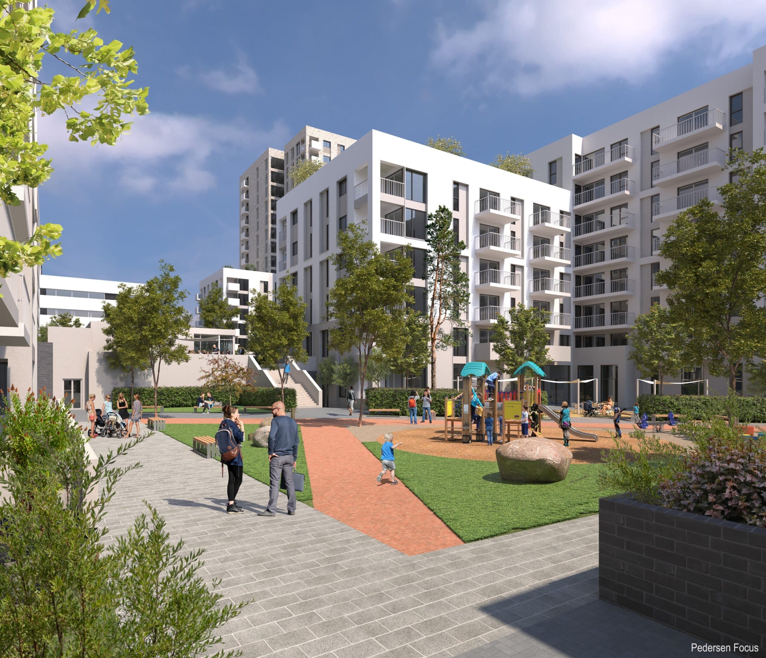 Conceived as a new quarter, incorporating a series of character areas that provide new urban spaces, residential courtyards, parkland and a town square addressed by a 15-storey landmark residential tower.