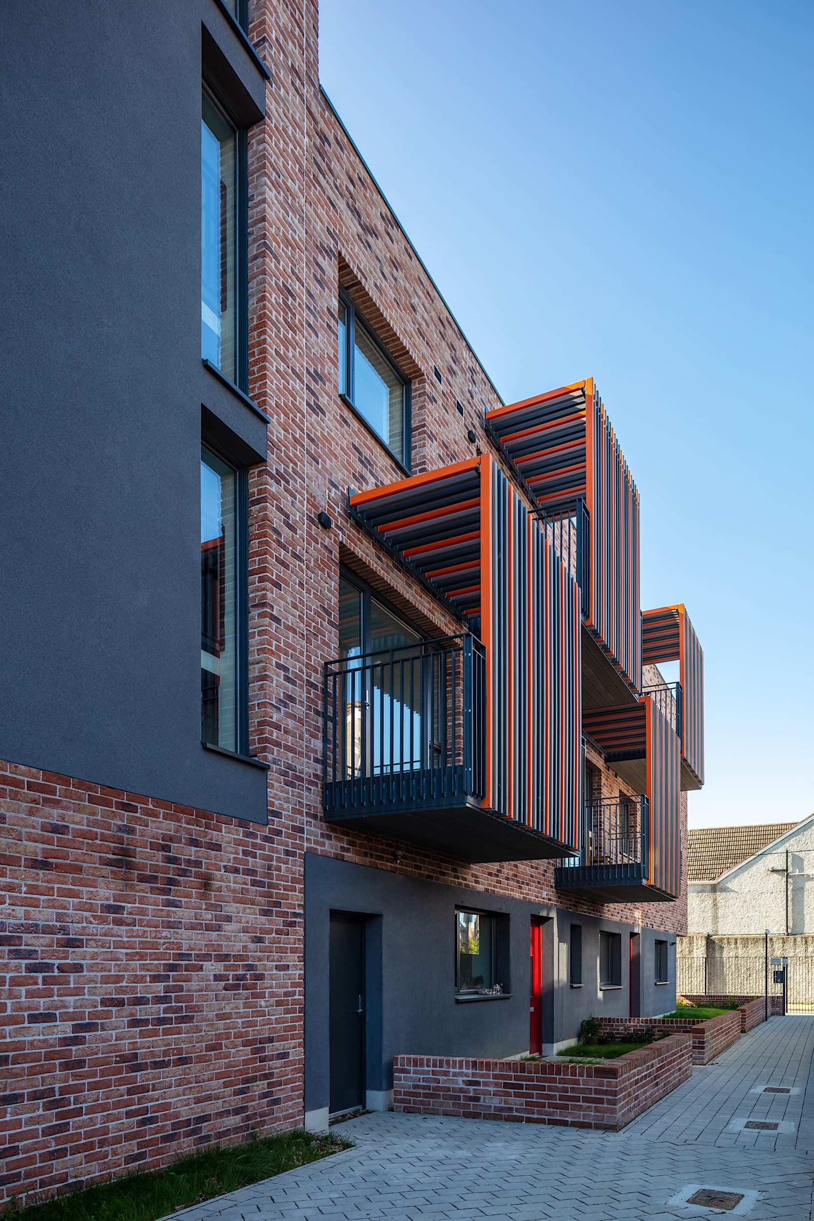 Ground floor units benefit from private front or rear gardens while the upper-level apartments are provided with a private balcony off-set between different levels. Full height glazing provides social engagement with the circulation spaces critical for community interaction.