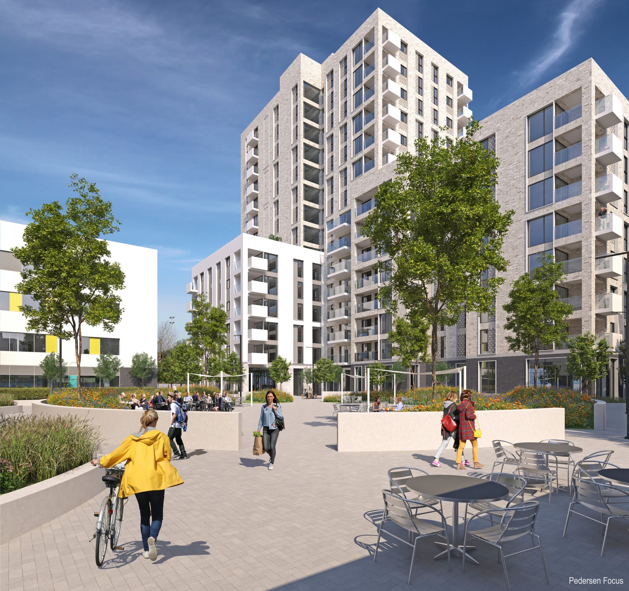 The courtyard space is generously sized and a focal point for the community with planters, pergolas and fixed seating. A community room also benefits from direct access to an adjoining outdoor terrace area.