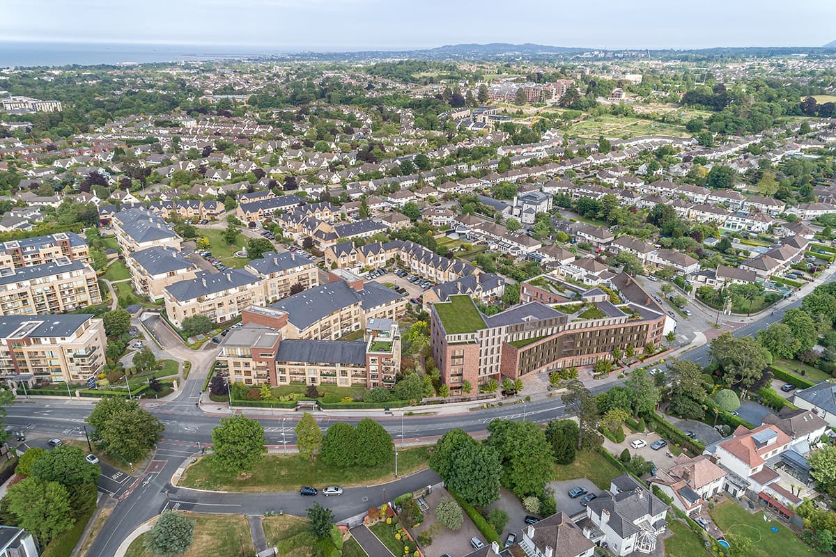The site, defined by its triangular shape, is bordered by an apartment complex and 2-3 story housing/duplex developments to the west and south, with the main Goatstown Road forming its third boundary.