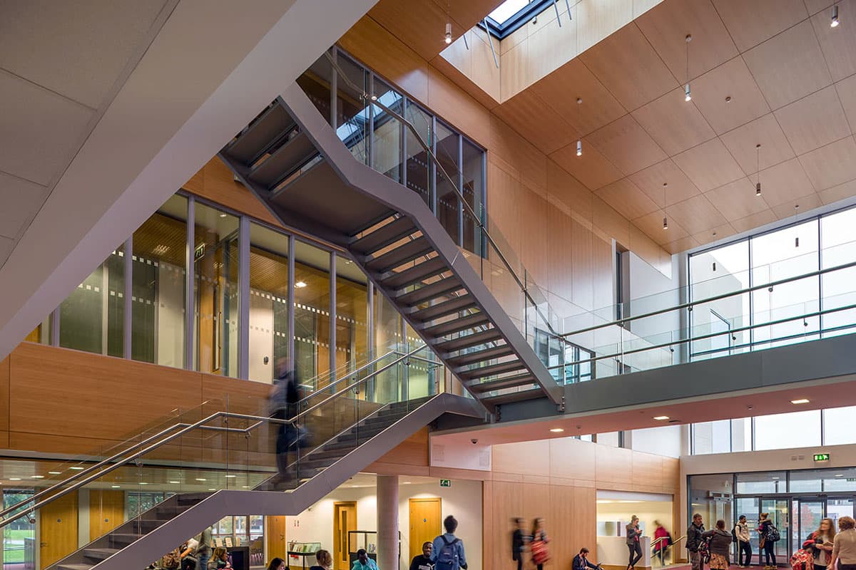 The extension is conceived with the pedestrian access routes and desire lines from the southern campus areas defining the building edge. The massing of the structure and its cantilevered form facilitates a dramatic new main entrance atrium link to the existing undergraduate and new post graduate facility as an interconnector of the existing Library and the new angular extension.