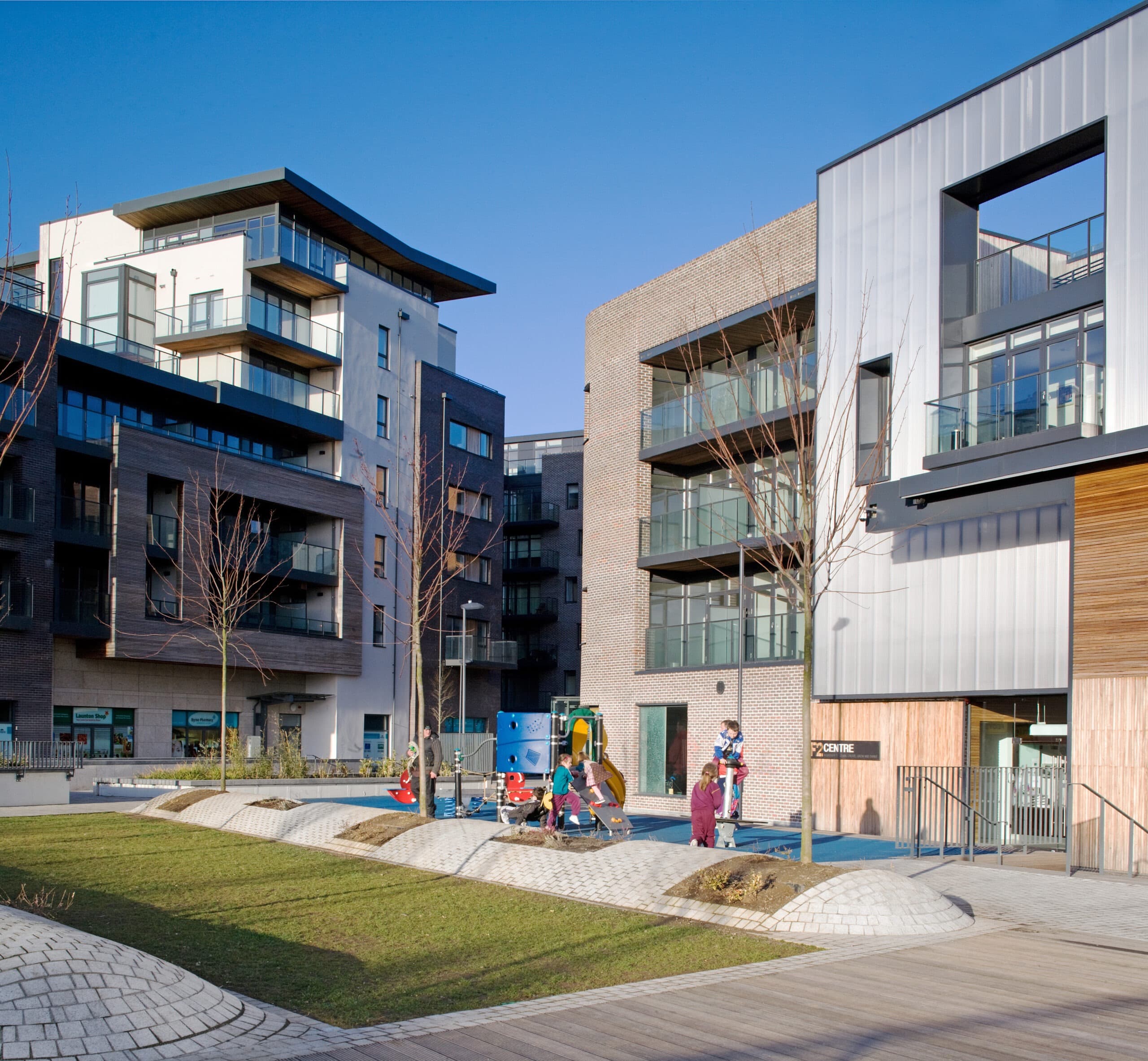 The development reopens previously closed circulation routes, extending roads through the site and providing a new public space as a focus for the wider community. New leisure amenities include a community centre and crèche, leisure centre and an all-weather football pitch. Play areas are provided for various age groups allowing for focused design and safety including areas of both hard and soft landscaping.