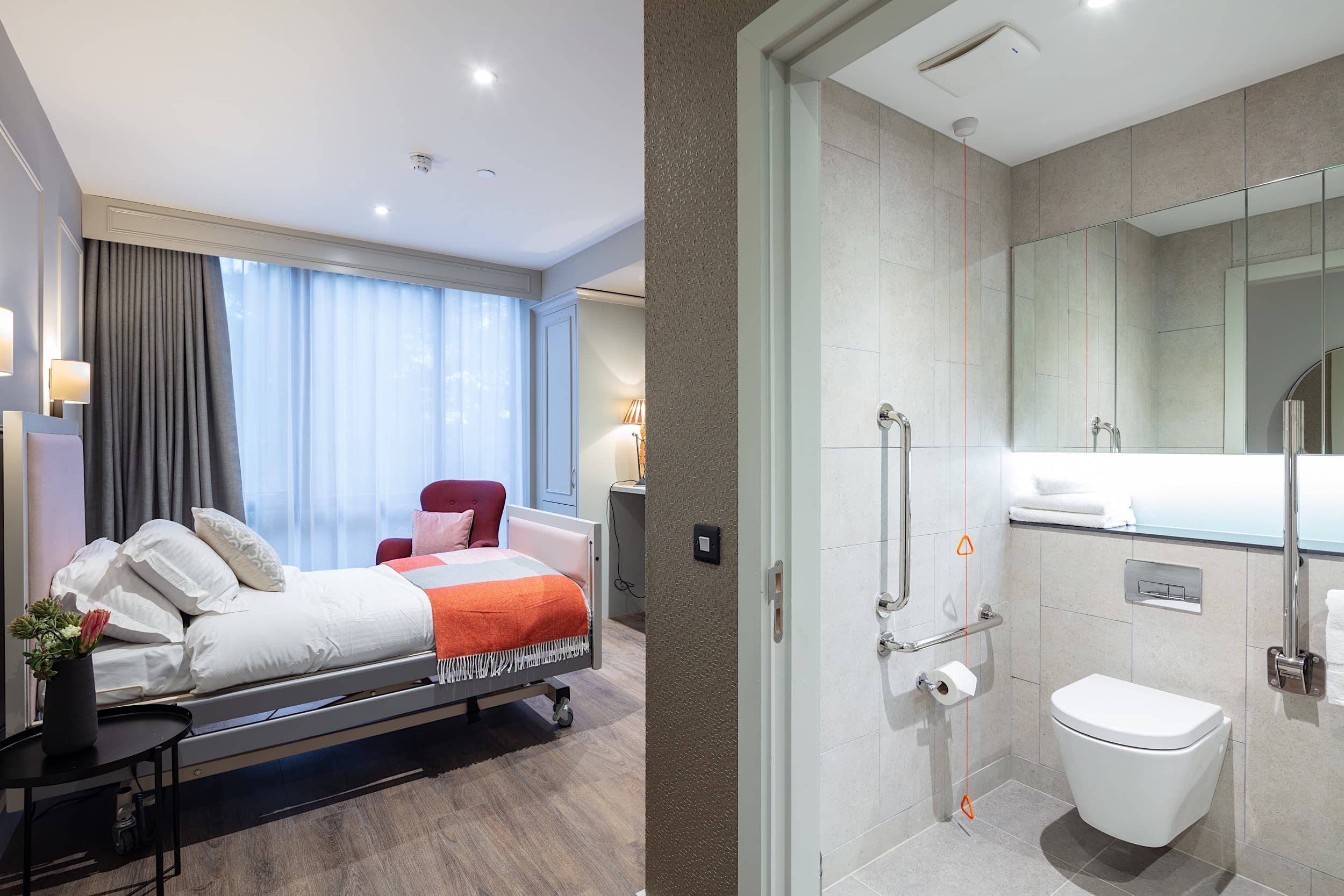 To accommodate residents who often need significant rest throughout the day, a bespoke clinical bed was designed which features an upholstered headboard and footboard in textured, antimicrobial fabric. All bedrooms were fitted with soft glide twin-track blackout and sheer curtains with easy-grab pull rods, as well as dimmable wall sconces.