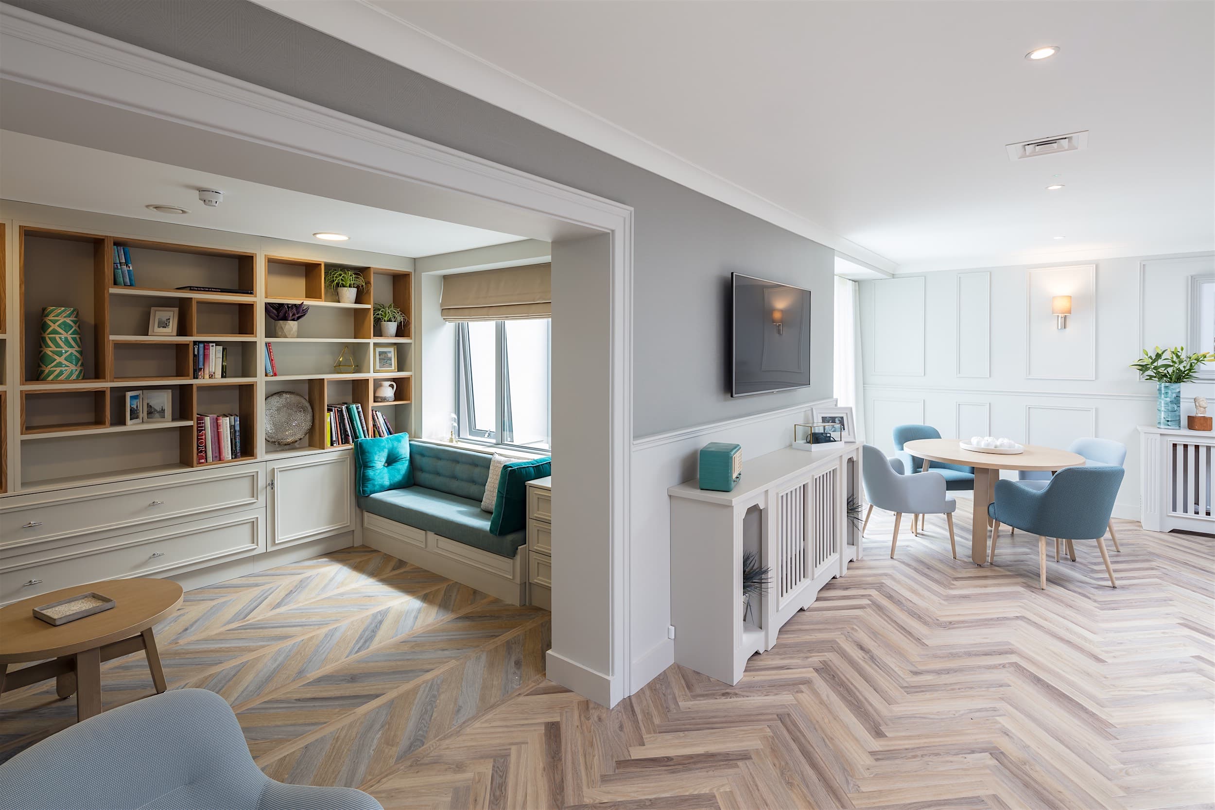 The scale of the home was intentionally reduced to create a more domestic feel by zoning each area with its own unique identity, reminiscent of a large country estate. Wings were aptly named the Conservatory, Pantry, Drawing Room, and Ballroom, each designed with a modern interpretation of these historical spaces. This design approach also provided intuitive wayfinding, making the building more familiar and comforting for residents.